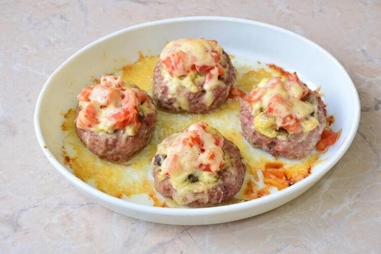 В чашу блендера помещают нарезанный лук, чеснок, красный перец и зелень, взбивают до однородности и добавляют в фарш. Туда же кладут яйцо, соль и специи, перемешивают. На пергаменте формируют круглые лепёшки из фарша и делают в центре углубления – гнёзда. Внутрь кладут кольцо помидора, немного плавленого сыра и кубики перца, сверху посыпают тёртым сыром и зеленью. Запекают при 180°C до готовности.