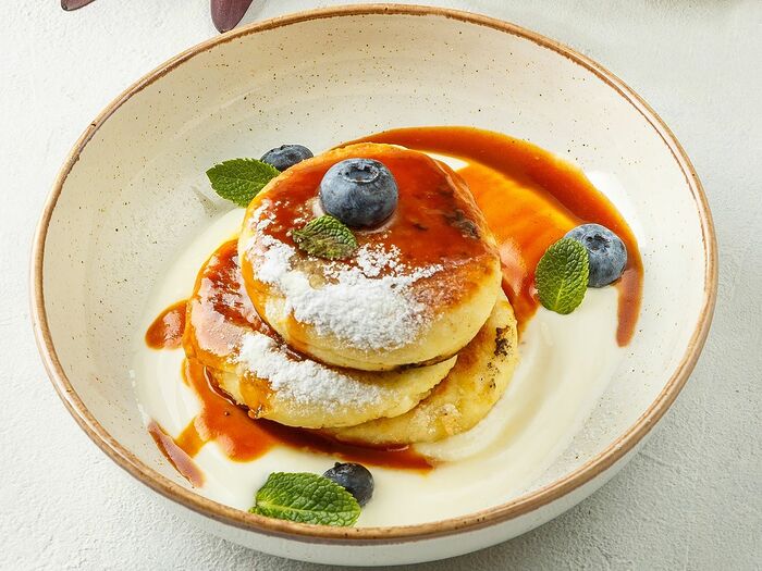 Творог смешивают с сахаром, мукой и ванильным экстрактом, перебивают блендером. Формируют сырники, присыпанные мукой, смазывают карамелью и выкладывают на пергамент. Запекают в аэрогриле, подают с ягодами и сметаной.