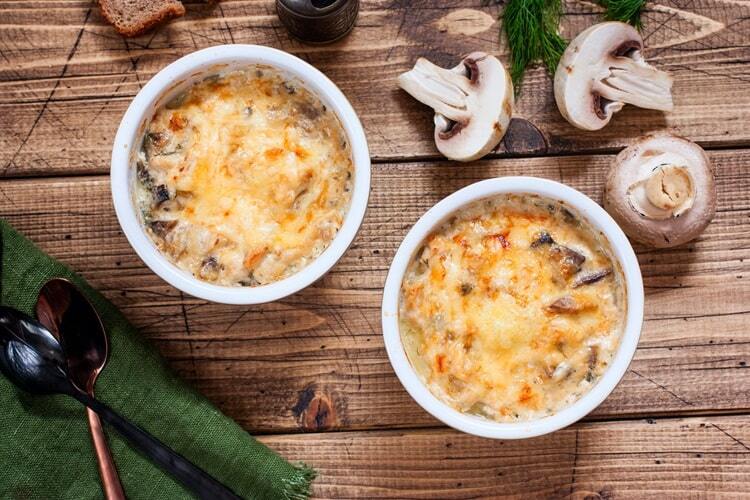 Лук и грибы обжаривают, добавляют нарезанную куриную грудку. Готовят соус из муки и сливок. Всё выкладывают в порционные формочки: грибы, курицу, соус и тёртый сыр. Запекают до румяной корочки.